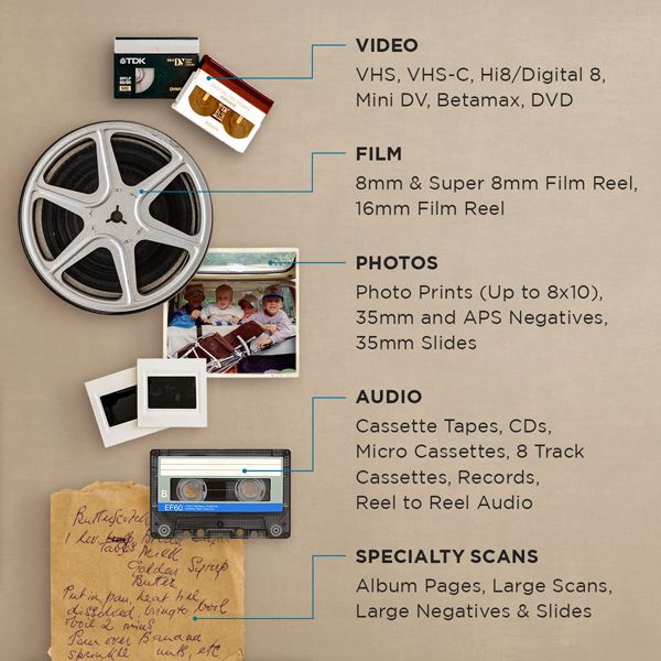 VHS, Beta, Hi8, Mini DV, DVD, or 3/4" U-matic