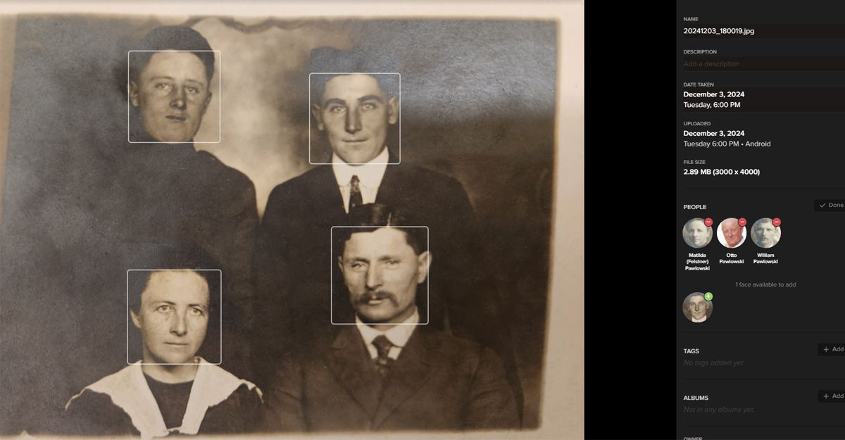 Melanie and I joked about using FOREVER Facial Recognition to help solve the puzzle. Curious, I snapped a picture of the photo with my phone. Within moments, three out of the four faces were identified! It was incredible – William, his wife Mathilda, and their son Otto were all recognized through Facial Recognition.
